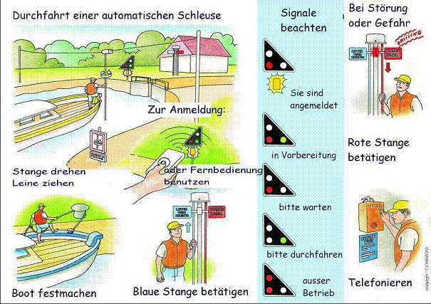 Regel für die Benutzung der Schleusen herausgegeben vom VNF ![]() GESCHWINDIGKEIT : Es wird daran erinnert, dass die höchst Geschwindigkeit auf dem Kanal auf 6 km/Std. begrenzt ist. In Rücksichtnahme auf andere, reduzieren Sie bitte Ihr Tempo bei Annäherung und Durchfahrt von Bootsanlegestellen. ALKOHOL : Es wird daran erinnert, dass die gesetzliche Bestimmungen betreffend Alkohol-Verbrauch die selbe als auf der Strassen sind, bzw. 0,5 g / l. Jede Übertretung kann Geldstrafe und Auto-Führerscheinentzug zur Folge haben. SICHERHEIT : Es wird daran erinnert, dass eine Schwimmweste getragen werden sollte während der Schleusung (Wirbel sind gefährlich). Kinder brauchen größte Aufmerksamkeit. RESPEKTIEREN SIE DIE ANWEISUNGEN UND REGELN : Bitte halten Sie sich an die von VNF Mitarbeitern gegebenen Navigation- und Sicherheitsempfehlungen und -Regeln von denen Sie eine Kopie an Bord haben sollten. RESPEKTIEREN SIE ANDERE : Im Sinn der im letzen Jahr registrieren unzivilisierten Situationen zu reduzieren, beachten Sie bitte die anderen Kanalbenützern : Sportschiffer, Fischer, Radfahrern, sowie arbeitende VNF Angestellten, usw. RESPEKTIEREN SIE DIE UMWELT : Bitte achten Sie auf die Natur und benützen Sie die Mülleimer und Mülltonnen die zu Ihrer Verfügung stehen in Häfen und Haltestellen so wie an einigen Schleusen. SCHLEUSENDURCHFAHRT : Auf einigen Sektionen werden die Schleusen automatisch betrieben. Die Boote sind entweder durch ein Radargerät gemeldet oder durch den Kapitän der sich selbst meldet mit einer Fernbedienung, oder durch Ziehung einer Leine oder Drehung einer Stange. IN NÄHE DER SCHLEUSE : Wenn die Tore geschlossen sind, nehmen Rücksicht um die Wirbel während der Füllung oder Leerung der Schleusekammer zu vermeiden, lassen Sie die Boote ausfahren, warten Sie bis die Tore geöffnet sind und das grüne Signal gegeben ist. DIE SCHLEUSENEINFAHRT : Halten Sie sich an die gegebene Anweisungen der VNF Angestellten oder die Signalsituation. VORSICHT : An den rutschigen Leitern oder Treppen. DAS ANLEGEN IN DER SCHLEUSE : Bitte nicht an ein anderes Boot oder in der Nähe der Tore festmachen, befestigen Sie die Halteleine vorne und hinten an einem Poller, Motor abstellen, und aufmerksam bleiben während der Schleusung ! DIE AUSFAHRT DER SCHLEUSE : Bitte die Halteleine nicht loslassen vor Ende der Schleusenphase und in Reihenfolge ausfahren. ALLGEMEINE INFORMATIONEN Schleusen: Frankreich hat ein umfangreiches Kanalnetz mit einer Vielfalt von Schleusen. Die großen Schleusen werden von Schleusenwärtern überwacht. Darüber hinaus gibt es automatischeSchleusen auf kleineren Wasserstraßen, Schleusen mit Schleusenwärtern und unbemannte Schleusen an kleineren Wasserstraßen (Seille). Die Schleusen bleiben in der Mittagszeit zwischen 12.00 Uhr und 14.00 Uhr für ca. eine Stunde geschlossen, oft auch die automatischen. Hinweis: Beim Schleusen auf der Saône und Rhône müssen Schwimmwesten getragen werden. Die Betriebszeiten der Schleusen für die Berufsschiffahrt sind einheitlich festgelegt. Für Sportbooten werden die Schleusen oft erst ab 9 Uhr bedient. Februar 7.00 bis 18.00 Uhr März 7.00 bis 19.00 Uhr 1. April bis 30. September 6.30 bis 19.30 Uhr 1. Oktober bis 30. November 7.00 bis 18.00 Uhr 1. Dezember bis 31. Januar 7.30 bis 17.30 Uhr Ausnahmen: Seine, zwischen Port Anglais und Cléon ganzjährig 7.00 bis 19.00 Uhr Rhône, ab Lyon stromab ganzjährig 5.00 bis 21.00 Uhr Keine Schleusung: 1. Januar, Ostersonntag, 1. Mai, Pfingstsonntag, 14. Juli, 1. November, 11. November, 25. Dezember. Es gibt eine Regelung des Funkverkehrs auch für Frankreich. Hier nachzulesen: http://www.plaisances.info/reglemantations/vhf