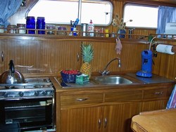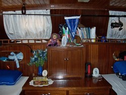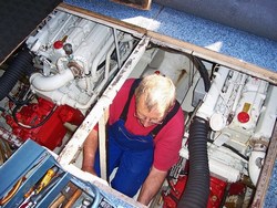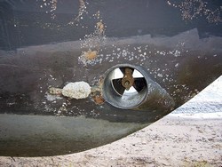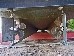 Die weißen Dinger an der Bugschraube und an den Rudern sind Opferanoden. Man nennt sind auch Zinkmäuse, obwohl sie auch aus Magnesium sein können. Je nachdem ob man in Süß- oder Salzwasser fährt. Dass sie sich wirklich für das Boot opfern, das sieht man ja. Beluga liegt an ihrem Steiger im Fluss, da entsteht galvanischer Strom, der unweigerlich Löcher in das Unterwasserschiff fressen würde. Auf dem Bild mit der Kopfschraube sieht man sogar, dass auch der Stahl um die Opferanode angegriffen ist. Deshalb gehen wir spätestens alle zwei Jahre auf die Werft, kontrollieren das Unterwasserschiff und und streichen es neu.