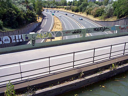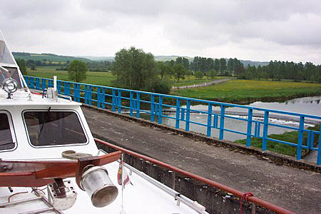 Kanäle die querfeldein laufen, müssen oft auch ein Tal, einen Bach oder eine Straße überqueren. Dazu braucht man Kanalbrücken. Sie sind genauso wie Brücken für Autos, nur dass Wasser darin ist und Boote darin fahren. Es ist ein tolles Gefühl, wenn man so von oben auf die Autobahn gucken kann. Diese Kanalbrücke überquert einen Bach. So sieht das aus, wenn man mit dem Boot auf eine Kanalbrücke fährt.
