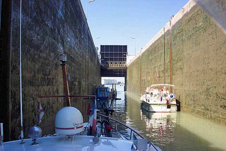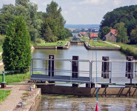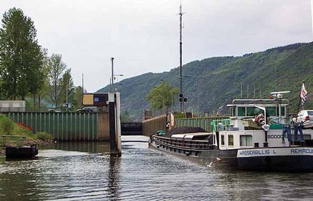 Ein Berufsschiff fährt in eine Mosel-Schleuse ein. Die Ausfahrt aus einer großen Schleuse am Oberrhein. In Frankreich hat man Kanäle kreuz und quer durchs Land gebaut, über Berg und Tal. Da war es oft notwendig, dass man viele kleine Schleusen hintereinander gebaut hat, ähnlich wie eine Treppe mit Stufen. Das nannte man dann auch "Schleusentreppe".