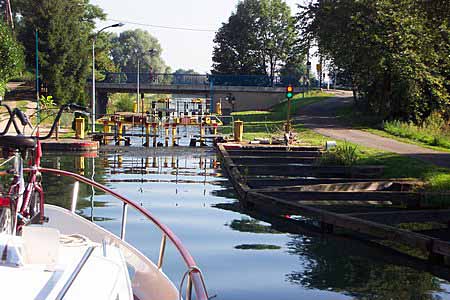 Und das geht so: Steht man mit dem Boot im Unterwasser der Schleuse und will nach oben, dann wird das Wasser in der Schleuse abgelassen und das Boot kann einfahren. Das Tor wird geschlossen. Dann wird wieder Wasser in die Schleuse laufen gelassen, bis sie voll ist. Das Boot, das in der Schleuse ist, wird mit dem Wasser nach oben gehoben. Ist die Schleuse voll, kann nach dem Öffnen des oberen Tores das Boot ausfahren und schon hat es das Hindernis überwunden und kann im Oberwasser der Schleuse weiterfahren. Umgekehrt funktioniert das genauso. Das Tor ist zu, die Schleuse wird gefüllt Steht das Boot im Oberwasser der Schleuse und will abwärts schleusen, dann müssen erst alle Tore geschlossen sein und die Schleuse voll Wasser laufen. Dann wird das obere Tor geöffnet und das Boot kann einfahren.