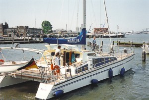 Und dann gibt es auch noch Katamarane, die haben zwei Rümpfe und sehen aus als wären es zwei Boote, die man zusammen gebunden hat.