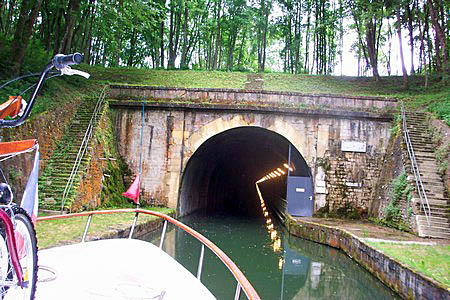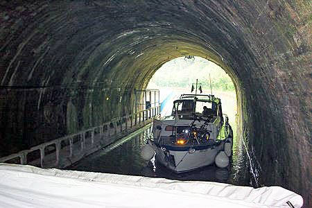 Es ist sehr eng im Tunnel. Auf einer Seite ist ein kleiner Weg. Den haben früher die Schiffsleute benutzt, wenn sie ihr Schiff durch den Tunnel gezogen haben.
