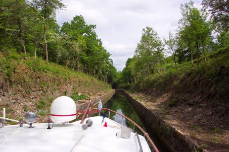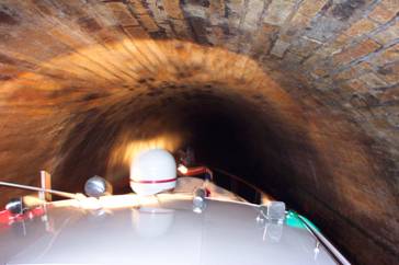 Der Einfahrtskanal zum Tunnel ist sehr schmal. Die Tunneleinfahrt 600 m voraus nicht einzusehen. Ich merke, wie meine Nebennieren Adrenalin in meinen Magen pumpen, das sich langsam Richtung Brustkorb ausbreitet. Es ist mir nicht wohl. Wenn wir nicht durch den Tunnel passen, müssen wir den schmalen Kanal rückwärts wieder raus. Unter Androhung drastischer Sanktionen habe ich meinen Kapitän aufgefordert nur ja keine Experimente zu machen. Ob er es beherzigt ? Nun ist es ja keinesfalls so, dass dies unser erster Tunnel ist. Im Gegenteil, wir sind schon Tunnel mit mehr als 5 km Länge gefahren. Doch die Höhe an den Seiten dieses Tunnels ist angegeben mit 2,20 m und die Röhre soll einen sehr runden Bogen haben. Wir sind am Aufbau über den Windschutzscheiben 2,80 m hoch. Haben wir nicht genügend Luft über den Seiten der Frontscheiben, können wir die Durchfahrt nicht wagen. Die geringste Abweichung aus der Mitte brächte uns in Kalamitäten. Der Einfahrts-Kanal zieht sich wie Kaugummi. Endlich schieben wir die Nase um die Kurve und der Tunneleingang erscheint. Das Loch ist riesig. „Das dürfte uns keine Probleme machen!“ „ Fahr trotzdem langsam und sei vorsichtig!“ Dann sehen wir, dass die Röhre unmittelbar hinter dem Eingang flacher wird. Wir halten beide den Atem an, schieben uns im Schneckentempo weiter. Über den Scheiben ist mindestens 40-50 cm Platz. Dass im Kanal ca. ein halber Meter Wasser fehlt kommt uns jetzt zu gute. Wir haben keine Probleme. Ohne das flache Wasser hätten wir nicht durch gepasst. Der Tunnel ist innen ausgemauert, ohne Treidelfahrt an der Seite und ohne jede Beleuchtung. Es ist stockdunkel, kalt und feucht. Irgendwie ist die Atmosphäre bedrückend, wie in einer Gruft. Manfred muss sich unheimlich konzentrieren um Beluga in der Mitte des Tunnels zu halten. Nicht so einfach auf einer Strecke von mehr als 3 km. Früher wurden die Schiffe von einem Kettenschlepper gezogen, das muss in dieser absoluten Finsternis noch ekliger sein. In der Tunnelmitte ist die Luft so feucht, dass sie undurchsichtig wird. Ein Blindenhund wäre jetzt gut. Die kleinen Nebeltröpfchen legen sich schwer auf die vom Adrenalin eh schon eingequetschte Lunge. In den Napoleonischen Kriegen wurden Kriegsgefangene zum Bau des Tunnels eingesetzt. Sie waren hier eingesperrt und wurden über die Entlüftungsschächte von oben versorgt. Nach Fertigstellung des Tunnels wurde ihnen die Freiheit versprochen, doch nur wenige überlebten. Die Toten wurden in den Tunnelwänden eingemauert. Die Dunkelheit ist erfüllt von ihren Geistern. Das Licht der Tunneleinfahrt lassen wir hinter uns, der Ausgang ist noch nicht zu sehen, erst in der Mitte sehen wir ein Licht am Ende des Tunnels das ganz langsam immer größer wird. Nach einer halben Stunde bin ich kalt bis in die Knochen, was mir natürlich schon wieder einen strafenden Blick von meinem Kapitän einbringt, weil ich keinen Pullover drüber gezogen habe. Obwohl ich es ja besser wissen müsste. Geschafft!! Wir sind im Herzen von Burgund! Von nun an geht's bergab.