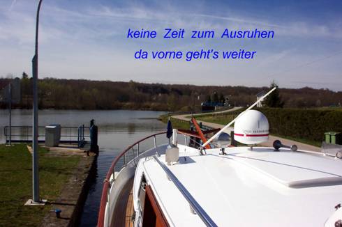 Ihre Quelle auf dem Col de Bussang liegt mitten in den Vogesen. Nicht weit davon findet man Gérardmér, die Heimat des Munster-Géromé, einem handlichen, aromatischen Weichkäse mit Rotschimmel. Entsprechend stinkt er auch. Die Geschichte des Käses beginnt mit dem irischen Benediktinermönch Columbanus. Er schlug sich mit einigen Getreuen nach Burgund durch, gründete dort mehrere Klöster und führte das Käsen ein. 20 Jahre später ging er nicht ganz freiwillig nach Italien, wo er auch starb. Nach seinem Tod brachten italienische Mönche die Lehre wieder zurück bis an den Rhein. Im Tal der Fecht gründeten sie ihr Monasterium, um das sich schnell ein Dorf bildete, das einfach Munster genannte wurde. Getreu der Ordensregel des heiligen Benedikt aßen die Mönche kein Fleisch, sondern ernährten sich hauptsächlich von Milchprodukten. Die warmen niedrigen Hänge benutzten sie zum Weinanbau, ihre Kühe fanden reichlich Weiden auf den Höhen der Vogesen. Mit den Jahrhunderten drangen die Munsteraner immer weiter vor, überschritten die elsässischen Höhenzüge und ließen ihre Tiere auf den Weiden in Lothringen grasen. Sie rodeten große Gebiete und schufen neue Ansiedlungen. An einem See gründeten Elsässer und Lothringer gemeinsam eine neue Stadt namens Sancti Gerardi Mare, aus dem später im Volksmund Gérardmér wurde. Wie das bei Elsässern und Lothringern zu erwarten, war die Zweisamkeit nicht lange harmonisch. Die Elsässer, die ihre Sommer auf den Almen, den chaumes, verbrachten und dort Käse machten, beanspruchten natürlich weiterhin die besten Weiden. Aber die Lothringer hatten ihnen die Kunst des Käsemachens abgeguckt und wollten keinesfalls zurückstehen, noch wollten sie länger dulden, dass ihr Käse, der Géromé, auf ihren Märkten vom Munster verdrängt wurde. Die Streitigkeiten wurden immer schlimmer und erst vom dreißigjährigen Krieg beendet. Da gab es nämlich keine Leute mehr, die streiten konnten. Die Dörfer und Weiden waren entvölkert. Es vergingen fast 100 Jahre bis die Käse-Tradition erneut aufgenommen wurde. Wer gegen Stinkkäse nicht allergisch ist, sollte einen Munster oder den größeren Munster-Géromé auf jeden Fall probieren. Wenn ich jetzt schon ein bisschen von unserer Route abgeschweift bin, ist es auch wichtig den Ort Saint-Dié zu erwähnen. Hier in den Vogesen, in St-Dié nannte im Jahr 1507 ein Mönch-Kartograph den neuen Kontinent, den Christopher Kolumbus entdeckt hatte, „Amerika“. Dabei bedient er sich des Namens von Amerigo Vespucci, jenem Forscher, der Brasilien entdeckt hatte. Auch die Freiheitsstatue wurde den Amerikanern von den Franzosen geschenkt. Der Überlieferung nach trägt sie die Gesichtszüge eines jungen Mädchens aus Nancy. Tja, Mister Bush! Was hätte Amerika nur ohne das alte Europa gemacht? Mit einer Schleusentreppe von 15 Kammern erklimmen wir die Scheitelhaltung in nur gut 2 Stunden. Jede Schleuse hat eine Hubhöhe von ca. 4 m, wenn auch in der Karte nur 3 m angegeben sind. Da wir alleine sind klappt natürlich alles wie am Schnürchen. Beim Einfahren in den Kanal sind mir schon neue Schilder aufgefallen auf denen der Kanal als Canal des Vosges bezeichnet wird. Dazwischen waren dann wieder Schilder an den Schleusen mit Canal de l'est, doch jetzt ist die Bezeichnung wieder Vogesenkanal. Ob die VNF hier einen Versuch startet den Kanal klamm heimlich umzubenennen? Leider entschwindet mit jeder Kammer, die wir aufwärts schleusen auch der Frühling. In den Vogesen ist immer noch Winter. Kaum ein Blättchen grün ziert Bäume und Büsche. Doch das schöne Wetter wird's schon richten.