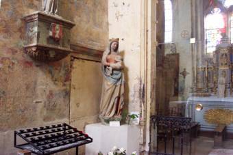 Flavigny ist ein Ort in dem sich so Altertümer wie wir, wie zu Hause fühlen. Alt, zauberhaft, viele Ruinen, aber auch viel Flair. Eine noch ältere Kirche. Der Zahn der Zeit hat kräftig an der Bemalung und am ganzen Gebäude genagt. Ein wahres Kleinod, die stillende Madonna und der lächelnde Engel. So menschlich! Im Obergeschoss hat manche Statue den Kopf verloren. Fantastisch geschnitzte und verzierte Bänke als Chorgestühl.