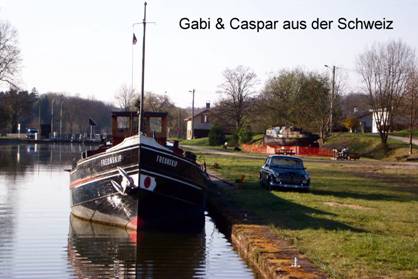 Die erste Abwärtsschleuse funktioniert leider nicht, doch ein Schleusenmeister hilft uns weiter. Unten liegt ein Luxemotor am Ufer. Das Schiff sieht aus als wäre es noch in Fahrt. Jedenfalls nicht ausgebaut. Keine Fenster im Laderaum. Doch daneben steht ein uralter Volvo. Also doch Pläsierschiffer? Manfred erkundet die Lage sofort. Schweizer! Das Boot liegt schon den ganzen Winter hier. „ Na das ist ja komisch, die haben doch hier weder Wasser noch Strom“. Menschen haben nun mal verschiedene Vorstellung wie sie ihr Leben einrichten. Doch wir erfahren, dass das Boot hier nur deponiert war. Die Skipper waren im Winter in der Schweiz. Manfred ist sicher, dass das Boot hier ohne Risiko liegt. Das winzig kleine Nest, in dem jeder jeden kennt, in dem es nicht mal einen Bäcker gibt und das Boot, dem jeder schon von weitem ansieht, dass darin nichts zu holen ist. Wo liegt da eine Gefahr? Trotzdem, mir wäre nicht wohl bei dem Gedanken. Wir zerbrechen uns noch eine Weile anderer Leute Kopf, als eine plötzliche Bewegung im Wasser anzeigt: eine Schleuse wird geöffnet, ein Schiff nähert sich. Das Boot, das die Schleuse hinter uns verlässt, ist uns nicht unbekannt. Dieses Gefährt in schwarz-rot-gold haben wir schon mal überholt. Die Bezeichnung Boot ist vielleicht geprahlt. Ein alter, langer, schmaler Nachen, darauf ein Holzverschlag als Aufbau. „In so einem Ding wollte ich aber nicht in Frankreich rumfahren. Was sind das überhaupt für Landsleute? Das Boot hat einen holländischen Namen, sieht auch aus wie holländisch selbstgestrickt“. „Die haben eine französische Flagge draus“. Hinter uns legen sie an und fragen uns in gutem Deutsch wann wir weiterfahren. „Heute nicht mehr, morgen früh“. Doch sie wollen weiter, das Wetter ist schön und es ist erst Mittag. Die nächste Schleuse ist wieder „en Panne“ und der reparierende VNF-Mann erklärt ihnen, dass heute keine Schleusenmannschaft mehr kommt, sie müssen morgen früh mit uns schleusen. Franzosen sind gesellige Leut. Sofort werden wir und die Schweizer zu einem abendlichen Umtrunk geladen. Nachdem einer der französischen Hunde ins Wasser gefallen ist, gerettet wurde und der Ausgang der Schweizer Katze mit dem Gassi gehen der Hunde koordiniert ist, finden wir uns bei Claude und Heidi im Steuerhaus wieder. Claude ist das Abbild des Franzosen. Nicht sehr groß, sichelbeinig, die Zigarette immer im Anschlag. Dem Rotwein nicht abgeneigt. Die typisch sinnliche Unterlippe des Genuss-Trinkers. Heidi war Deutsche. Sie haben zuhause Hühner und Enten und einen großen Garten. Alles wird eingekocht und mitgenommen. Auf dem Kajütdach steht ein Kübel in dem Salatpflanzen wachsen. Wir sind amüsiert, probieren ihre selbstgemachte Paté, finden den Geschmack unvergleichlich, auch wenn sie vorher mit den gleichen Händen gerade eine Zwecke aus einem ihrer Hunde entfernt hat. C'est la vie francaise. Natürlich lässt sich meine Neugier nicht zügeln. Ich muss genau wissen woher sie kommen. Von Saargemünd! Aha! Das Boot liegt an der Schleuse 1 im Saar-Kohle-Kanal. O, kennen wir ja alles. Am Stockweiher haben wir Bekannte. Manfred verdreht die Augen. „Ach hör schon auf, ich muss doch fragen, es könnte ja sein, dass sie Babalou kennen!“ Ein Aufschrei der Freude: „Natürlich kennen wir Babalou, wer kennt den nicht. Ich habe sogar eine CD von ihm, mit Autogramm“. (Ich auch, drängt er jedem auf.) Die Welt ist klein. Haben wir Babalou doch vor 4 Jahren in Bar-le-Duc getroffen. Ein Original, wie aus Jacques Bistro. Seine Brötchen hat er verdient als Lampenschirmvertreter, doch in seinem wahren Leben ist er ein „Artiste“ ein begnadeter Sänger, ein unerkanntes Genie. Ich habe großes Verständnis für ihn. Hoffe nicht auch ich ganz im Geheimen, dass ein Verlag an meine Tür klopft, mir meinen neuesten Reisebericht aus den Händen reißt und erklärt, dass die Welt nur auf Doris den Möchtegern-Westentaschen-Poeten gewartet hat und die glänzenden Euros nur so sprudeln? Wir fragen die Schweizer warum sie denn keinen Kran auf dem Boot haben um ihr Auto aufzuladen. Igitt, so was wollen sie ja schon überhaupt nicht. Wie sieht denn ein Schiff aus, auf dem ein Auto steht? „Wir haben extra nichts an dem Boot verändert, auch am Laderaum nichts. Wir wollen, dass es wie original aussieht“. „Auch die Penischen-Fahrer haben ihr Auto hinten drauf, das finde ich gar nicht so hässlich“. Wie händeln sie nur ihr Auto? Und schon haben wir eine Lawine losgetreten. Gabi ist ängstlich. Sie hat Angst vor allem Neuen und Unbekannten. So fahren sie jeden Kilometer erst mal mit dem Auto ab, erkunden ob die Umgebung günstig ist für die Katze und ob auch ja keine Menschen in der Nähe sind. Dann geht es zurück zum Boot. Das Schiff wird eine oder zwei Schleusen weiterbewegt. Mehr nicht, das ist Stress genug. Dann fährt Caspar mit dem Velo zurück und holt das Auto. Auch eine Art Frankreich kennenzulernen. Wir fragen, wie sie denn zum Bootfahren gekommen sind. Sie waren früher Segler, natürlich. Dann hat Gabi mit 36 Jahren ihre Karriere beendet, sie war Sozialarbeiter (eine brillante natürlich), um sich selbst zu verwirklichen, dem Stress zu entgehen und Köchin zu werden. Doch das artete schon sehr in Arbeit aus und Geld konnte man auch keines verdienen. Ein kleines Restaurant wurde eröffnet (als Experiment). Doch die Gespräche der Gäste waren zu seicht, zu nichtssagend, zu viel Small-Talk, obwohl die Gäste natürlich der gehobenen Geistesschicht angehörten. Also, Frust! Vor 10 Jahren wurde der Luxemotor angeschafft. Gabi wollte sich selbst finden. Sie wollte sich verwirklichen und die absolute Freiheit finden. Doch sie hat ihren größten Feind mit an Bord gebracht: Sich selbst! Sie nennt sich einen schwierigen Menschen. Sie lehnt ein Handy an Bord ab, hat keinen Autoführerschein, schreibt wenn es sein muss im zwei Finger-System auf einer mechanischen Schreibmaschine, hat noch nie einen Computer angefasst. Das Boot heizen 