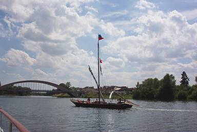Um vom Nivernaiskanal in den Canal Latéral à la Loire zu kommen, müssen wir die Loire selbst durchfahren. Eine der seltenen Gelegenheiten wo man überhaupt noch in die Loire einfahren kann. Im Granitgestein des Zentralmassivs entsprungen, windet sie sich gemächlich durch das Land, als ob sie es genießen würde das üppige Frankreich kennenzulernen. Allmählich wird sie breiter, umspült Sandbänke, ist heute teilweise untief und versandet, nimmt einen völlig launischen Verlauf, wurde deshalb von der Schifffahrt völlig aufgegeben. Einer der letzten naturbelassenen Flüsse in Europa. die Loire bei Decize ein typischer Loire-Kahn im Einsatz und originalgetreu restauriert Immer noch sind wir in Burgund, wenn man es auch nicht so Recht glauben kann. Der Loire-Seitenkanal vervollständigt die Bourbonnais-Route, welche die Seine mit der Saône verbindet. Klammheimlich verlässt er das Departement Nievre, betritt das Departement Allier, verlässt somit Burgund, nur um sich im Departement Saône-et- Loire, dem letzten Departement in Burgund, das wir dieses Jahr noch nicht befahren haben, mit dem Canal de Centre zu verbinden. Der Canal de Grande Jonction, der Lateralkanal führt durch eine freundliche, aber ereignislose Landschaft. Doch im Gegensatz zu den beiden Kanälen, die wir hinter uns haben, hat er erfreulich wenig Schleusen.