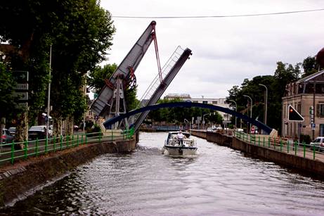 Die Schweizer unter einer Hebebrücke in Montceau-les-Mines Wider alle Unkenrufe sind die Schleusen bis zur Scheitelhaltung randvoll Wasser. Von dem angeblichen Wassermangel ist absolut nichts zu merken. Auch die Speicherseen auf der Scheitelhaltung des Kanals sind immer noch gut gefüllt und beim Abwärtsschleusen laufen die kurzen Stauhaltungen in der Schleusentreppe fast über. Alle Gerüchte über die Schließung am 1.August entpuppen sich als das was sie sind, als Scheißhausgerüchte, sorry! Der Kanal führt durch ein wunderschönes Waldgebiet, an vielen stillgelegten Keramikfabriken vorbei. Die sehr gewundenen, dicht umwaldeten Kanalabschnitte sind teilweise von außerordentlicher Schönheit und hinterlassen unvergessliche Eindrücke, wenn da nur nicht die Straße wäre. Was an anderen Kanälen immer noch der Treidelpfad ist, wurde hier zu einer Landstraße ausgebaut, die zwar nicht besonders breit aber dennoch stark befahren ist. Der Lärm des Straßenverkehrs wird aber noch übertroffen von den ständig vorbei donnernden TGVs.