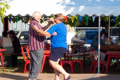 Die Grand Fête beginnt erst am Sonntag. Samstag ist der Angeltag der Franzosen. Der von der Hotelpenische befreite Sportbootanleger ist belagert von Fischern. Außer einem Franzosen kommt aber kein anderes Boot, das anlegen will. Und auch der Franzose sucht sich einen anderen Platz nachdem er geduscht und seinen Wassertank gefüllt hat. Um halb fünf trifft erneut ein Kleinlaster und ein Schwarm Arbeiter ein. Sie stellen drei Zelte rund um die Tanzfläche auf. Wir wären nicht in Frankreich, wenn nur eine Zeltstange gerade wäre oder wenigstens die gleiche Richtung wie die anderen hätte und wenn die gelungene Aktion nach Beendigung nicht mit allseitiger Beglückwünschung und einem kleinen Umtrunk besiegelt würde. Für die Grand Fête am Sonntag haben wir einen Logenplatz. Das kann ja heiter werden. Sonntagmorgen acht Uhr fährt ein Lieferwagen vor, rangiert direkt neben uns. Bourgognes Paillard steht auf der Motorhaube, ein Hängel Weintrauben ist darauf abgebildet. Hoffnung keimt auf. Das Auto wird abgeschlossen, der Fahrer verschwindet mit einem dazugekommenen Anlieger, wahrscheinlich gehen sie erst mal frühstücken. Um Punkt zehn kommt ein Fahrzeug der commune de St.Leger. Fahrer und Beifahrer laden Tische und Bänke aus. Ehrenamtliche Helfer stehen rum. Alle haben die Hände in die Hüften gestemmt. Das Aufstellen, die Platzierung wird genau besprochen. Lautstark und gestenreich natürlich. Auto und Fahrer düsen ab. Machen Platz für einen Lieferwagen aus Louhans. „Manfred, dein Abendessen ist gerettet, das ist bestimmt eine Hähnchenbraterei, denn Louhans ist die Hühnerstadt in der Bresse.“ Wohlgefälliges Knurren ist die Antwort. So sicher bin ich mir allerdings nach ein paar Minuten nicht mehr. Auf dem Auto steht: Transports express Frigorifiques. Ein bisschen hin und her rangieren bringt den Wagen endlich in eine günstige Position. Doch jetzt ist das Zelt im Weg. Also muss es um einen halben Meter versetzt werden. Alles packt mir an. Dann noch mal 10 cm, doch jetzt beäugt alles misstrauisch den Baum, irgendwie scheint sein Blattwerk im Weg. Man beschließt einstimmig, dass der Baum sich zu bescheiden hat und ein bisschen Gedränge ertragen muss. Die Erdnägel zum Befestigen der Zeltstangen werden neu eingeschlagen. Das Tischerücken kann weitergehen. Drei Mann arbeiten, fünf Mann debattieren, drei Mann stehen dabei und haben die Hände bis zum Ellbogen im Säckel. Manfred und Luciano stehen natürlich auch wichtig rum, aber ihre Shorts sind zu tief unter den Bauch gerutscht und sitzen zu stramm, um die Hände in den Hosensäcken zu vergraben. Die Absperrgitter werden um das ehemalige Hafenbecken aufgestellt, das jetzt eh nur noch 50 cm Wasser hat. An der Kanalseite, wo das Wasser 1,80 m tief ist, passiert nichts. Kabeltrommeln werden ausgerollt. Ein Dicker mit dem Gesichtausdruck eines magenkranken Heilbuttes, mit offenem Hemd, offenem Mund und Brüsten, dass ich ganz neidisch werde, umrundet mehrere Male kritisch das Geschehen.