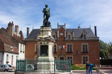 Das Gebiet, das wir heute Frankreich nennen, war in der Geschichte ein geographischer Flickenteppich. Immer umkämpft und von wechselnden Machthabern beherrscht. Die Saône durchfließt die Franche-Comté und Burgund. Im 15. Jahrhundert war Burgund ein mächtiges Königreich zwischen Deutschland und Frankreich. Die Franche-Comté war ein Teil Burgunds bis sie nach Unabhängigkeit strebte und sie auch ertrotzte. Die Franche-Comté kann mit wundervollen Spezialitäten aufwarten, die mich immer wieder meine guten Vorsätze von Enthaltsamkeit vergessen lassen. In Käse ist sie fast nicht zu schlagen, vom Comté bis zum Vacherin, der nur bis Ende Mai verkauft wird. Wunderschöne kleine Orte, bekannte und berühmte Städte, die Wiege des Nationalgetränks der Franzosen, der Geburtsort von Viktor Hugo und Luis Pasteur, aber auch von Rouget des Lisle, dem Verfasser der Marseillaise, das Jura, ein seltener Wein, herrliche glasierte Dachziegel, Burgen, Kirchen und Klöster, Bauwerke für deren Schönheit man glatt den Mönchen die Möncherei verzeihen kann, die Franche-Comté hat einen ganz eigenen Charme. Man muss sie lieben. Und wer sie nicht kennt, sollte meinen Reisebericht vom letzten Jahr noch einmal lesen. Bei km 268 überschreiten wir die Grenze des département Haute-Saône, verlassen die Franche-Comté und erreichen das département Côte d'Or in Burgund. Bourgogne ist das Hauptziel unserer Reise. Ob es uns allerdings gelingt den Burgund-Kanal zu fahren muss sich erst noch herausstellen, doch so weit sind wir noch lange nicht. Rechts von uns zweigt der Canal de la Marne á la Saône ab. Wer die Patina historischer Wasserbauten und die Stille der französischen Provinz liebt, wie wir, für den lohnt eine Fahrt durch diesen Kanal auf jeden Fall. Jedoch ist die Schönheit der Stille kein gängiges Ideal in unserer heutigen Zeit und so ist der Kanal selbst in der Sommersaison wenig befahren. Auf der einen Seite, kann man froh sein für jedes Boot das den Kanal nicht befährt, auf der anderen Seite sind aber wenig befahrene Kanäle immer von Schließung bedroht, da ihr Unterhalt zu aufwendig und teuer ist. Doch man kann eigentlich immer auf die Entschlossenheit der französischen Behörden hoffen, sich keinen auch noch so wenig befahrenen Kanal entgehen zu lassen. Ein mehr als nur unbeständiges Wochenende verbringen wir im Busch, mit grillen und Lagerfeuer bis in den Himmel. Normalsterbliche würden mit Rauchvergiftung im Krankenhaus liegen, doch wir finden es einfach nur wunderbar. Manfred hat wohl in einem Anfall von Langeweile in seinen Schätzen gewühlt und ist dabei auf eine Flagge der Haniel-Reederei gestoßen, ein bunter Gockel grün umrahmt. Es gibt keinen Menschen, zu dem diese Fahne besser passt als John. Also flattert sie jetzt an seinem kleinen Mast. Und der Funkname wurde natürlich sofort den Neuerungen angepasst. Aus Whisky one wurde Chickenman! Halleluja!! Unser nächster Aufenthalt ist Auxonne. 1788 kam der Leutnant zweiter Klasse, Napoleon Bonaparte, in die Garnisonstadt Auxonne. Er war 18 Jahre alt und fiel durch seine Ernst haftigkeit und seinen Fleiß auf. Er studierte drei Jahre an der königlichen Artillerieschule, danach verließ er Auxonne um sich in Valence dem Regiment von Grenoble anzuschließen. So kann man denn ohne Bedenken behaupten, dass in Auxonne das große Napoleonische Abenteuer begann. Zur Demonstration seiner Allgegenwärtigkeit steht der Kaiser versteinert vor dem Hotel de Ville.