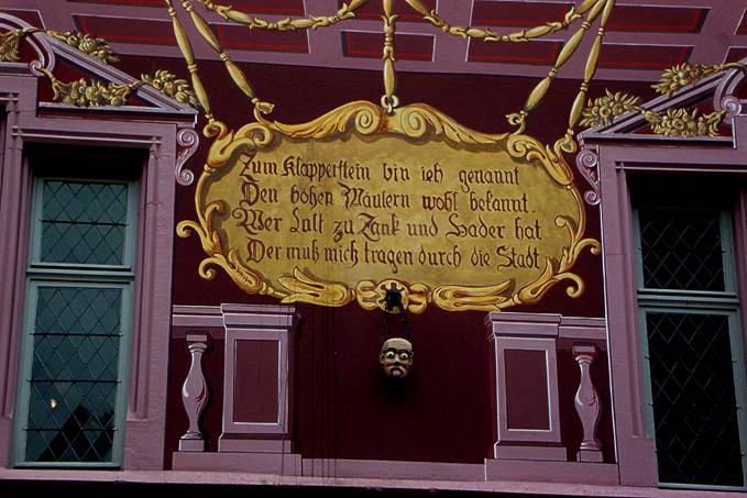 Der Klapperstein am goldenen Haus in Mulhouse. Wie die Innschrift sagt, mussten ihn die bösen Mäuler zur Strafe durch die Stadt tragen. Ein netter Brauch, leider wurde er abgeschafft.