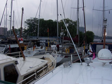 Eigentlich sollten wir sofort wieder gehen, doch es ist zu spät. Die Durchfahrt durch die vielen Brücken schaffen wir nicht mehr. Also harren wir aus. Drei Stunden später liegen noch drei Boote neben uns und acht Boote vor uns. Wir sind eingekeilt wie drei in einem Schuh. Und neben uns, der Segler in der Box verkündet, dass er morgen hier weg will. Dann muss das ganze Chaos sich irgendwie auflösen. Wenigsten kommen Helfer des Hafenmeisters und rangieren die Charterboote. Wir werden auf jeden Fall auf einen Besuch von Amsterdam verzichten und die Gelegenheit wahrnehmen hier wieder zu verschwinden. Dafür dürfen wir dann noch 22 € für die Übernachtung bezahlen. Eigentlich hätten sie den Betrag halbieren müssen, denn wir hatten nur eine halbe Nacht. Die österreichischen Charterer neben uns haben die Nacht zum Tag gemacht. Erstaunlicherweise bleibt morgens das Chaos aus. Vor uns bindet ein Boot nach dem anderen los und verschwindet. Die Charterboote werden auf die andere Seite gezogen und wir können auch raus. Leider bekommen wir nicht mehr mit, wie die große Segelyacht aus der Box in die Boxengasse rangiert.