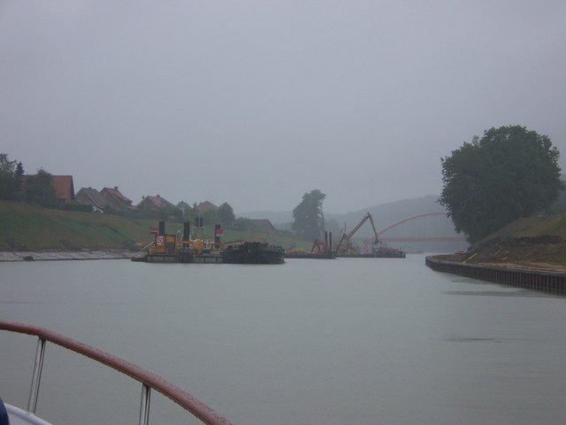 Nur sieben Jahre haben die Preußen gebraucht um diesen Kanal und alle seine Brücken und Schleusen zu bauen. Das nennt man preußische Gründlichkeit! Er ist ein Großschifffahrtskanal und man kann nicht behaupten, dass er einem vom Sockel reißt. Derzeit ist er eine einzige Baustelle, das Kanalbett wird verbreitert, Brücken und sonstige Über- und Unterführungen müssen neu errichtet werden. Die diversen Baustellen sorgen für den einen oder anderen Stau, genau wie auf der A 61. Und genau wie dort, sind auch hier viele holländische Schiffe und Boote dabei. Das Wasser ist vom Baggern sehr aufgewühlt und Manfred brummelt etwas von seinen armen Impellern, die sich bei dem Sand abreiben wie Radiergummis. Münster hätte ich gerne angeguckt, aber Manfred rümpft die Nase. Der Stadthafen ist ihm suspekt. Hier will er nicht übernachten und seine Beluga für einen Landgang alleine lassen schon überhaupt nicht. Die Lage des etwas außerhalb liegenden Yachtclubs oberhalb der Schleuse sagt ihm auch nicht zu, also fahren wir weiter in die Marina „Alte Fahrt Fuestrup“. Das soll mir recht sein, da wollte ich eh hin. Schließlich schreibe ich für ihren Hafenkurier Kolumnen. Gleich zwei Mann kommen gerannt und helfen uns beim Anlegen. Das ist auch gut so, denn hinten an Dalben und vorne an Land ist vom Boot aus schwierig. Der Empfang ist ausgesprochen herzlich. Und es geht uns so richtig gut. Morgens gibt es frische Brötchen und samstags leiht uns Klaus, der Inhaber der Marina, ein Auto um zum Markt zu fahren. Im Restaurant lernen wir gleich am ersten Abend ein holländisches Ehepaar kennen. Beide sehr nett und gesellig. Bier bekommt Kees nicht sonderlich, wenn er ein Glas trinkt, schleppt er drei Richtung gebrauchte Getränke. Ich verzeihe ihm das gerne, schließlich hat er mir ein Buch abgekauft. Pünktlicher als ich je zu hoffen wagte, ist mein neuer PC eingetroffen. Jetzt heißt es Arbeit nachholen. Ich kann nicht beschreiben, wie groß der Stein ist, der mir vom Herzen gefallen ist. Ohne Laptop hätte ich nicht mal mehr Bilder machen können, geschweige denn meine Berichte schreiben. Obwohl das vorhergesagte Regengebiet heranrauscht, legen wir ab. Wir wollen weiter. Den ganzen Tag schüttet es wie aus Kübeln. Die Heizung läuft im Ruderhaus auf Vollgas und trocknet immer wieder die Regenjacken und –Hüte. Da für die Nordsee Starkwind vorhergesagt ist, entschließen wir uns in Haren in den Haren-Rütenbrock-Kanal abzubiegen und die Inlandroute nach Holland zu nehmen. In unserer letzten Schleuse im DEK bleibt uns die Spucke weg. Die Schleuse hat keine Wände. Natürlich hat sie Wände, aber die sind schräg, weil sie noch in ihrem Urzustand von vor über 100 Jahren ist. Für Berufschiffe wurden Dalben in die Schleuse gestellt, damit die sich dort festbinden können, doch für kleine Boote ist es echt schwierig. Da wir abwärts schleusen und die Schleusen eh unheimlich langweilig sind, kann man das Boot gut abhalten. Aufwärts schleusen wollte ich hier aber nicht. Zu allem Überfluss geht morgens, als ich noch im Bett liege und auf warmes Wasser und das Frühstück warte, der Jockel aus. Kein Strom wäre eine wirklich Katastrophe für uns. Wir könnten noch nicht mal Kaffee kochen. Doch nach einer Stunde basteln springt die Maschine wieder an. Danke Skipper!