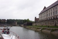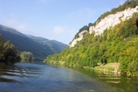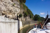 Der Doubs Die Schleuse in den Canal du Rhône au Rhin kann man ganz leicht übersehen, doch wir passen natürlich auf, hier werden wir uns die nächsten 4 Wochen aufhalten. Am 5.9. passieren wir hinter Dole eine Platanen-Allee, die uns sehr an die schönsten Stellen am Canal du Midi erinnert. Ach, hätten wir nur jetzt ein kleines bisschen Hitze vom Midi, wir könnten sie gut gebrauchen. Es ist typisch für weite Strecken des Doubs, dass sich Fluss und Kanal ständig abwechseln. Das hat einen ganz besonderen Reiz. Oft ist der Kanal nur im Einbahnverkehr zu befahren. Die Strecke nicht breiter als die Schleuse. Dann etwa 2 m höher neben uns eine Straße, vom Kanal nur getrennt durch Betonpoller, die verdächtig an Zinnen erinnern. Du hast das Gefühl im Burggraben zu fahren. Ein kurzes Stück Tunnel. Aus dem Berg gehauen sieht er fast aus wie eine Grotte. Am Ausgang ein Standbild der Mutter Maria. Diese Hilfe haben die Penichenfahrer sicher auch gebraucht. Nach dem Tunnel geht der Kanal rechtwinklig weiter. Selbst wir müssen rangieren, mit einer Maschine vorwärts, der anderen rückwärts, damit wir die Nase ums Eck bekommen. Vor der ersten Doppelschleuse haben wir unfreiwilligen Aufenthalt. Doppel rot heißt Ausfall. Nach einer Stunde geht's weiter. Liegeplätze sind sehr spärlich. Und obendrein auch noch von Hotelpenichen oder den Riesen-Pötten der Holländer und Engländer belagert. Damit haben wir keine Probleme, wir ankern gern. Beim Verlassen der Schleusen fahren wir oft direkt am wilden Wehr vorbei. Mit aller Macht versucht es das Schiff an sich zu reißen. Das bedarf schon großer Aufmerksamkeit und Umsicht von meinem Kapitän. Die ganze Betonnung am Doubs ist etwas abenteuerlich. Plötzlich siehst du vor dir einen kleinen roten Zipfel aus dem Wasser ragen. Das ist wohl der Rest einer abgesoffenen Tonne. Oder am Ufer steht ein Schild >15 m. Also, musst du 15 m raus, nur wie lange? Ein anderes Schild sagt >70 m. Ich habe nicht gedacht, dass der Doubs hier überhaupt 70 m breit ist. Eine Kurve und vor uns ragt der Felsen von Besancon auf, der Hauptstadt des Franche-Comté. Obendrauf wie der Deckel auf einem Topf die Citadelle von Vauban. Gigantisch. Wir sind mutig und nehmen "la Boucle du Doubs" So kommen wir in den Genuss einer richtigen Stadtrundfahrt, mit alten Patrizierhäusern und auf der anderen Seite den prächtigen Quadersteinbauten. Dazwischen die trutzigen Befestigungsanlagen und Wachtürme, auch sie von Vauban, im Auftrag Ludwig XIV. "Die Kunst der Befestigung hat nichts mit Regeln und Systemen zu tun, sondern orientiert sich ausschließlich am gesunden Menschenverstand und der Erfahrung". Vauban war der größte und erfolgreichste Feldherr und Baumeister seiner Zeit. In der von ihm gebauten Befestigungsanlage in Metz hielten die deutschen Truppen 1944 mehr als zwei Monate lang ihre Stellung gegen General Eisenhower. Das bedarf keines zusätzlichen Kommentars. Eine Fahrt durch das unberührte Doubs-Tal ist für jeden Naturfreund ein unvergessliches Erlebnis. Der Fluss hat derzeit durch die vielen Regenfälle einen halben Meter mehr Wasser als normal. Jedes noch so kleine Wehr ist jetzt ein richtiger Wasserfall. Die Sogwirkung auf das Schiff ist enorm. Der Strom fließt so schnell wie der Rhein im Binger Loch. Bei richtigem Hochwasser möchte ich hier nicht unbedingt fahren. Ankern kann man vergessen, viel zu gefährlich bei der Strömung. Aber in den Kanalstücken findet man schon ein Plätzchen am Ufer, auch wenn man sich an der Leitplanke festklammern muss. Die Schleusen im Doubs sind zum größten Teil automatisiert, d.h. wir haben so eine Art Garagentordrücker, geben damit Signal und die Schleuse setzt sich in Betrieb. In so einer Kammer sind wir gerade am hochschleusen, als ein Auto von der VNF angerast kommt. Ganz aufgeregt steigt eine junge Frau aus, fuchtelt mit den Armen und macht uns verständlich, dass ein Commerce (Peniche) kommt. Sie ist sehr aufgeregt. Manfred wirft das Funkgerät an:" Bateau Beluga verlässt die Schleuse 42." "Hier Spitz Wallhall, beeil dich, ich bin schon kurz vor der Schleus und kann in dem starken Strom nicht aufstoppen." "Bin schon aus der Schleuse, fahr ruhig weiter, ich schaffe vor dir die Ausfahrt aus dem Schleusenkanal." Manfred mit Vollgas durch den schmalen Ausfahrtskanal. Die Nase kaum im Strom. " Beeil dich kann nicht stoppen." " Sind schon draus." Wir schießen aus dem Loch in den Fluss, der Penich direkt neben uns dreht schon das Achterschiff. Alles gut geklappt. "Hinter mir kommt nichts mehr, was einen Spitz anbelangt." Na ein Penichen-Spitz am Tag in ner brenzligen Situation, das reicht ja wohl. Zum Glück wars einer aus Saarbrücken, wegen verstehen und so. Die Dame von der VNF begleitet bei diesen Wasserständen das Berufsschiff um die Schleusen klar zumachen, dass es gleich einfahren kann. Müsste er anhalten und warten bis die Schleuse aufgeht, stände er quer im Strom und würde es nie mehr schaffen in den schmalen Schleusenkanal einzufahren. Ab und an ein kleiner Adrenalinstoß hält wach. Die Franzosen sind ein Volk der Angler. Leider sitzen sie immer auf der falschen Seite des Kanals, sonst bräuchten sie keine 10 m langen Angelstöcke um am gegenüberliegenden Ufer zu fischen. Sehr aufmerksam beobachten wir seit Monaten die Angelerfolge und ich muss gestehen, wir haben noch keinen Angler gesehen, der einen ordentlichen Fisch am Haken hatte. Tja, um einen Schlauen zu fangen, darf man keinen Dummen schicken. Vielleicht sollte Frankreich doch besser beim Boule-Spiel bleiben. Der Doubs verlässt uns jetzt, dient nur noch als Wasserreservoir und langsam nähern wir uns der Grenze des Franche-Comté. Nehmen Abschied von seinen so typischen, mit bunt glasierten Kacheln belegten Kirchtürmen. Wenn du morgens einem Angler ein fröhliches "bonjour" zurufst und er zurück knurrt "morn", dann bist du im Elsass. Die deutschen und schweizer Einflüsse sind unverkennbar. Man darf nicht einen ganzen Volksstamm über einen Kamm 