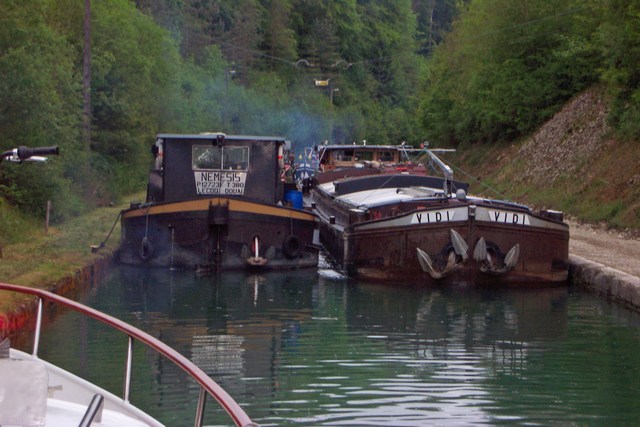 Es ging aufwärts mit ihnen. Zwölf Schleusen aufwärts mit einer Treppe und der fast 5 km lange Tunnel von Mauvages. Das war der Tagesplan. Diese beiden Schleusentreppen und die zwei Tunnel hatten sie schon des Öfteren an nur einem Tag bewältigt. Das konnte sie kein bisschen tangieren. Zwar zeigte sich der Himmel konturlos, doch er schien seine schwere Fracht noch nicht abwerfen zu wollen. Die Schleusen waren hoch. Die Poller standen ungünstig für ihre Schiffsgröße. Das Wasser schoss durch die geöffneten Schütze wie ein Sturzbach. Es beutelte Belugas langen Bug von einer an die andere Schleusenwand. Sie beschlossen Beluga an Bug und Heck zu belegen. Das Tau mit dem Bootshaken einhängen ging nicht, sie reichte nicht hin und von unten waren die Poller nicht mehr auszumachen. Also musste das Tau geworfen werden. Auch das war kein Problem. Doris war ein geübter Lassowerfer. In vielen hundert Schleusen trainiert. Aber es war harte Knochenarbeit. Zwölf Schleusen, die längste Stauhaltung dazwischen gerade mal gut einen Kilometer, die meisten um die 600 m. Da blieb nur Zeit die Taue wieder zu richten oder schnell einen Schluck Wasser zu nehmen. Schon war der nächste Seilakt angesagt. Drei Stunden harte Arbeit. „Jetzt haben wir's geschafft“, sagte Manfred, als sie endlich die Scheitelhaltung erreicht hatten, „ nur noch der Tunnel, das war's dann für heute.“ In der ersten Schleuse, in der sie auch die Fernbedienung für die Treppe erhielten, drückte ihnen der Schleusenmeister vier wichtige Zettel in die Hand. Die neuen Durchfahrtsbestimmungen und Regeln für den Tunnel. Sie rätselten, warum man heute wohl durch den Tunnel gezogen wurde. Ob irgendwann mal was passiert ist? Oder waren es einfach neue Gesetzte wegen des Tunnelunglücks damals am Mont Blanc? Sie wussten es nicht. Es war auch nicht von Bedeutung. Ein Tauer, was auch immer das heißen sollte, es war ein elektrisch betriebener Kettenschlepper, zog die Schiffe im Konvoi, der Rame. An Bord der Schiffe dürften sich nicht mehr als 8 Personen befinden. Warum nicht? Pubten die zu viel Methangas aus? Was machten die Hotelpenichen mit ihren Gästen? Sollte deren Problem sein. An Bord durfte nicht geraucht werden, nicht gekocht, nicht mit Gas geheizt und auch sonst kein Rauch erzeugt werden. Aber die Sportboote sollten den Motor nicht ausschalten, um manövrierfähig zu bleiben. Was also sollte diese ganze schwachsinnige neue Regelung. Wenn man den Motor laufen lassen konnte, konnte man auch selber fahren. War Abgas von Verbrennungsmotoren weniger giftig als Zigaretten oder Zigarren-Rauch? Die einzig vernünftige Warnung war die vor den Stromleitungen an der Tunneldecke. Wenn ein Bootshaken mit 600 Volt Bekanntschaft macht, könnten drunter in Sekundenschnelle gegrilltes Boatpeople liegen. Zwei Stunden Pause, zum essen und sich ausruhen, dann schoben sich zwei Penichen gemächlich, im Schneckengang auf sie zu. Sie passten kaum an der vor ihnen wartenden Peniche vorbei. Penich Nemesis, Beluga, Chez Otti. Das war die Reihenfolge. Nemesis übergab ihre Taue an den Kettenschlepper. Dann übernahm der Skipper die Taue von Beluga. Anschließend hechtete Doris zum Heck um die Taue von Chez Otti zu übernehmen. Die Rame stand, es konnte losgehen. Der Tauer setzte sich in Bewegung. Nemesis kratzte seitlich an der Mauer des Ufers. Der Skipper drehte wild am Steuerrad. Die Heckwelle verbeutelte Beluga, zerrte auch sie gegen die Rundung des Ufers in der Kurve. Chez Otti wurde mit dem Heck gegen das Ufer gepresst, die Fender hüpften aufs Gras. Na, das fing ja schon richtig gut an. Der Tauer verschwand im Tunnel. Nemesis machte den Motor aus. Der Tunnel war taghell beleuchtet. Diesen Tunnel hatten sie früher schon mehrmals innerhalb von 30 Minuten alleine durch fahren. Manfred holte eines der Taue etwas nach, damit Beluga besser in der Mitte des Kanals blieb. Leider Fehlanzeige. Ständig wurde sie mit der Steuerbordseite gegen den Laufsteg gedrückt. Oh, die armen neuen, schweinisch teuren Fender. Manfred kurbelte wie verrückt, setzte die Bugschraube ein. Es half immer nur Minuten. Jede Bewegung von Beluga übertrug sich auch auf Chez Otti. Luciano drehte sein Ruder in alle Richtungen. Das Heck scheuerte an der Mauer. Mit dem Motor zerrte er Chez Otti von der Mauer weg und Beluga auf die Seite. Mit dem Erfolg, dass Beluga noch schneller und härter gegen die Mauer prallte. Der Schiffsmann von Nemesis setzte sich auf seine Reling um mit den Füßen sein Schiff von der Mauer abzustoßen, damit endlich das durchdringende Kreischen von Stahl auf Stein aufhörte. Das Brummen des Motors und das Rattern der Oberleitung des Tauers war schon nervtötend genug. Nemesis legte sein Ruder anders. Die Verwirbelung des Wassers drückte Beluga an die linke Tunnelwand. Hier war kein Laufsteg. Die Fender wurden plattgedrückt wie Pfannekuchen. Jeden Moment musste einer platzen oder abreißen. Doris sprang auf, drückte mit beiden Händen mit all ihrer Kraft gegen die Tunnelwand um den Abstand zu vergrößern. Immer und immer wieder. Es gelang. Manfred drehte am Rad. In jeder Beziehung. Er fluchte und kurbelte und alles zur gleichen Zeit. Die Kilometrierung an der rechten Tunnelwand zeigte 300 zurückgelegte Meter. Der Tauer legte das affenartige Tempo einer „escargot“ vor. Auch der Schiffsmann der Nemesis versuchte sein Schiff so gut wie möglich vor Beschädigungen zu bewahren. Er steuerte, legte Ruder, stieß ab. Luciano hinter Beluga gut abgedeckt, gab das Spiel schon ziemlich schnell auf. Er fuhr dicht auf Beluga auf, ließ das Tau durchhängen und steuerte selbst. Einen Moment nicht aufgepasst und er donnerte wieder mit Bug oder Heck gegen die Wand, riss dann sein Ruder herum und Beluga mit. Das, dachte Doris, wäre doch eine hervorragende Körperertüchtigung für die Damen des Fitnessstudios. Hier könnten sie ihre überschüssige Energie loswerden. Das Ambiente wäre vielleicht nicht so edel, dafür die Hände aufgerissen und verschrammt