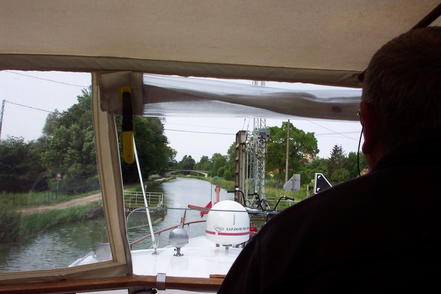 Die Bootfahrer hatten sich voll auf den Barometer verlassen. Das ganze Wochenende zeigte er Katastrophen-Wetter an, obwohl es eigentlich ganz ordentlich war. Ab Sonntag ging's aufwärts mit ihm, doch das Wetter war anderer Meinung. Es regnete Bindfäden als sie ablegten und war saukalt. Den fast 5 km langen Tunnel machten sie mit links. Und dann kam eine Schleusentreppe die automatisiert war. So ging es flott voran. Der angekündigte Penich Jannik passierte sie bereits an Ecluse 5 und als sie viertel vor zwölf vor Ecluse neuf standen, war die Ampel rot. Also war Mittagspause angesagt. Um ein Uhr passierte ein anderer Penich die Schleuse und sie machten sich wieder auf. Die Schleusenampel zeigte rot/grün, die Schleuse war in Vorbereitung. Das Tor öffnete sich, blieb halb offen stehen, die Ampel sprang auf rot. Über dem avisierten Kanal 10 meldete sich natürlich keiner. Erst als Luciano in Französisch rief, bekam er Antwort von einer weiblichen Stimme. Es käme sofort jemand, wurde ihm versprochen. Nach einer halben Stunde fragte die gleiche weibliche Stimme über Funk, wo sie denn überhaupt wären. Nach einer weiteren halben Stunde trudelte ein VNF-Auto ein und die Dame setzte die Mimik elektrisch in Betrieb. Die Ampel sprang auf grün/rot, das Tor ging auf, die Ampel behielt stur ihr rot bei. Luciano hupte zwei Mal mehr als aufdringlich. Die Schleusendame rannte wieder in ihr Hüttchen. Die Ampel ging aus, sprang dann auf rot, das Tor begann zu klingeln, klingeln hörte auf, die Ampel sprang auf rot/grün. Luciano hupte. Die Ampel sprang auf grün. „Siehst du,“ rief er über Funk „da musss man erscht zwäimal hoorrnen, bis dasch das grüne Licht erschient.“ Und Manfred rief zurück: „ Aber das viele hoorrnen hat auch die Himmelsschleusen geöffnet, da hascht du äinen Fählerr gemaacht.“ Nach dem Mittag wollten die Schleusen einfach nicht mehr richtig funktionieren. Jede Zweite setzte aus und musste in Gang gesetzt werden. Leicht ung eduldige Temperamente könnten hier durchaus beglückende Augenblicke akuter Krisen des Selbstbewusstseins durchleben. „Schau dir das an“, Manfred deutete bei Ecluse 16 auf eine zu Schau gestellte deformierte Schiffsschraube, „hier ist doch tatsächlich einem Penich beim Warten der Propeller abgerostet.“ Und von hinten plärrte Luciano durch den Funk, dass das Echo durchs ganze Tal raste: „I han dene aber g'sacht, dass dess än Schießedräecke gsie.“